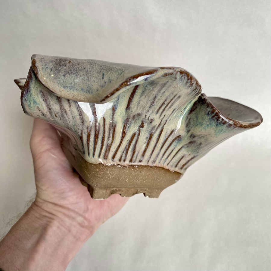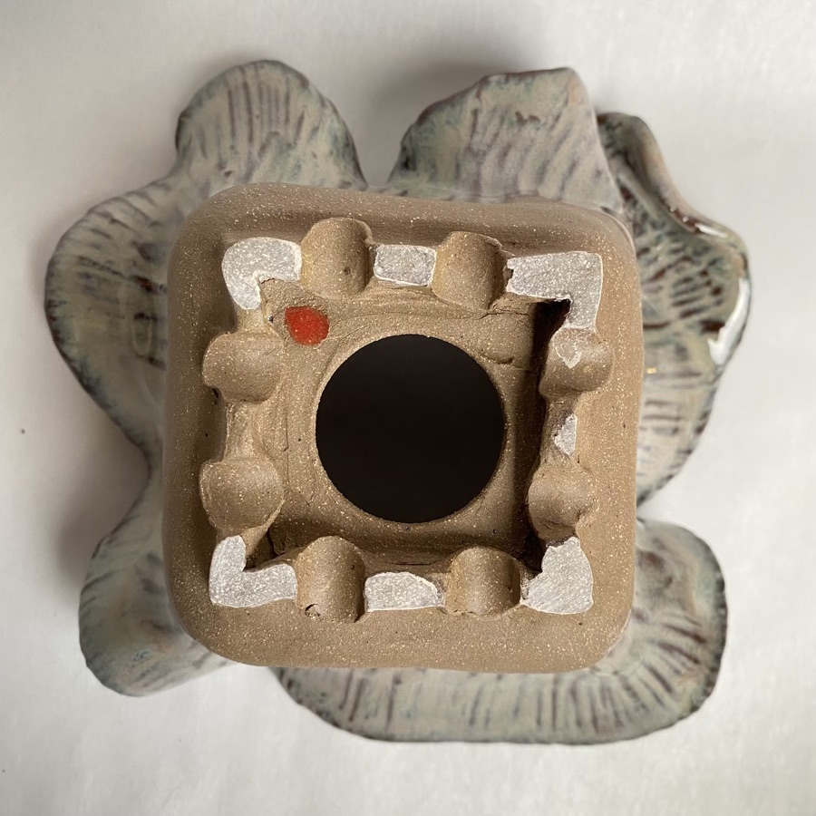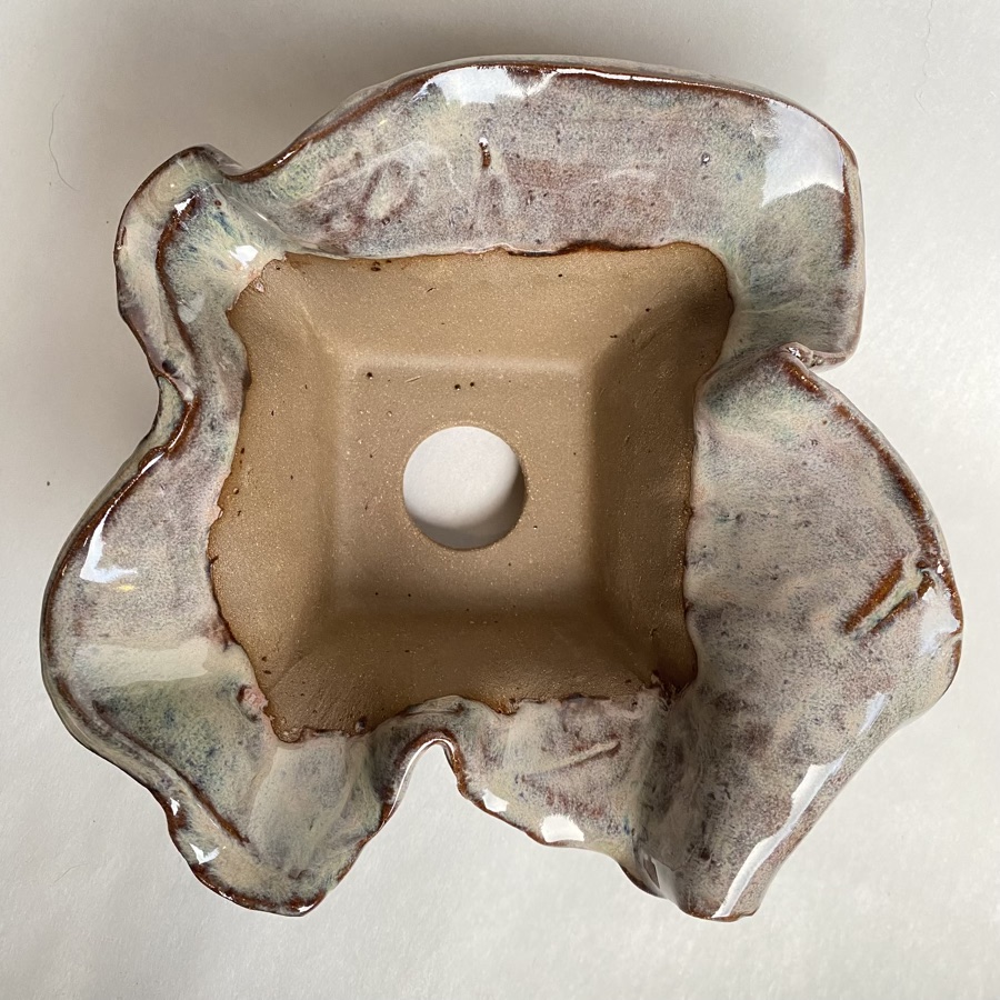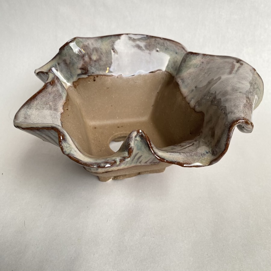 Unnumbered pot. Measures a little under 8” square and a bit over 4” tall. Inside potting well is roughly 4″ square by 2-1/2″ deep.