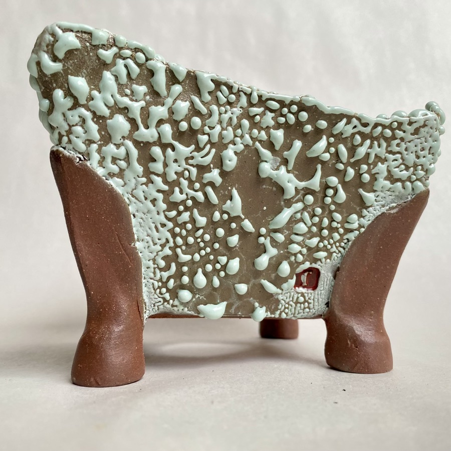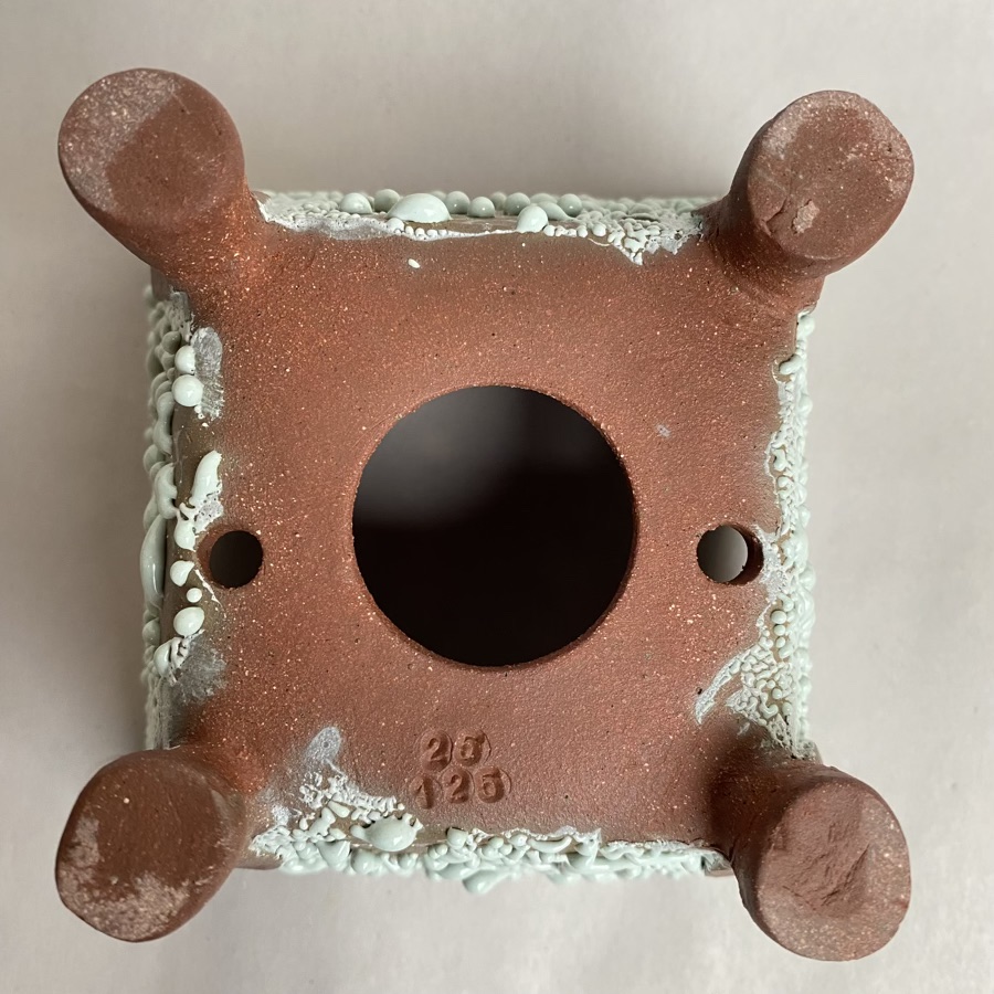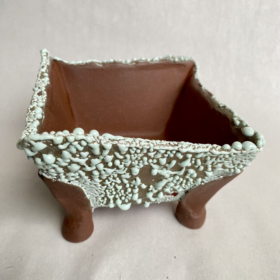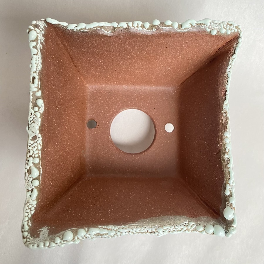 Measures approximately 4-1/2” square and a bit over 3-1/2” tall. Inside potting well is roughly 4″ square by 2″ deep.