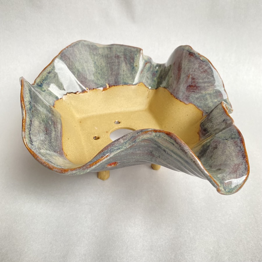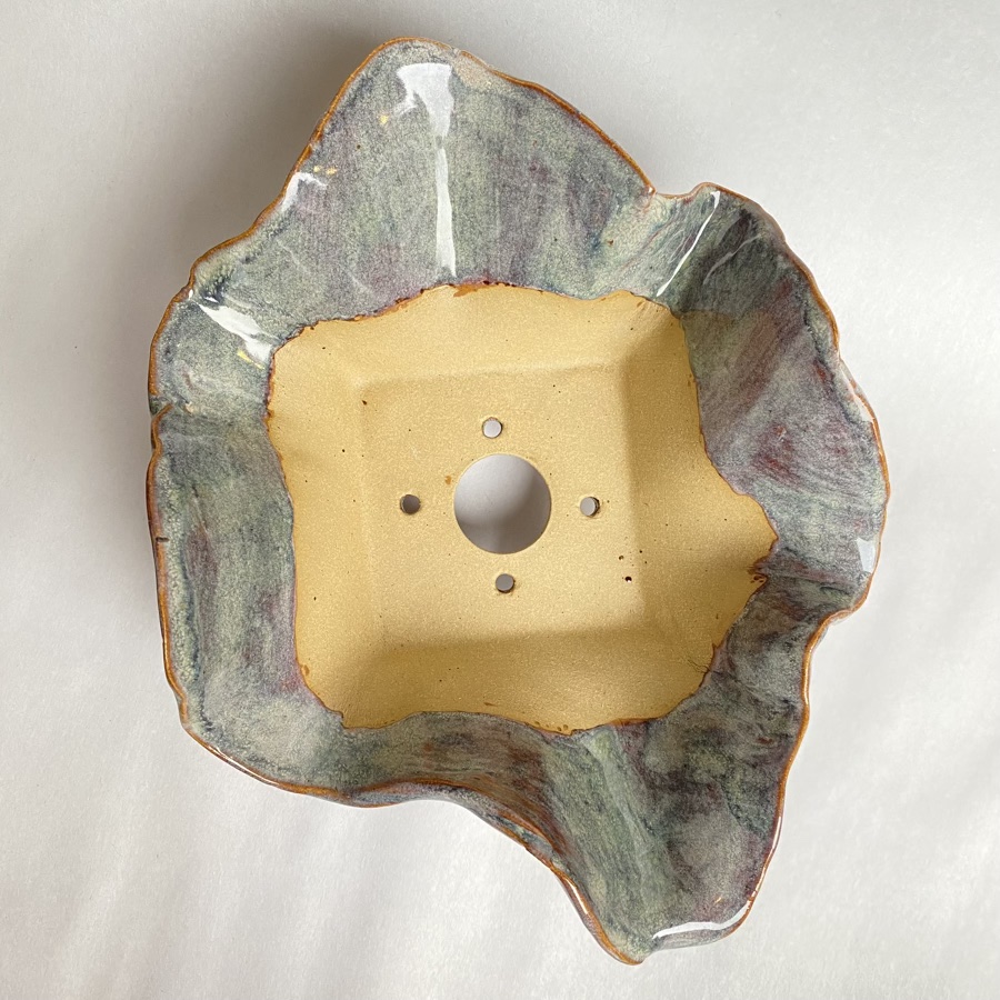 Measures approximately 10” at its widest and just under 5″ at its tallest. Inside potting area is roughly 5-1/2″ square by 2-1/2″ deep.