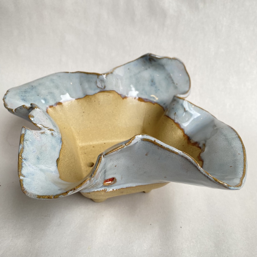 Measuring approximately 7” square and a bit over 4” tall. Inside potting well is roughly 4″ square by 2-1/2″ deep